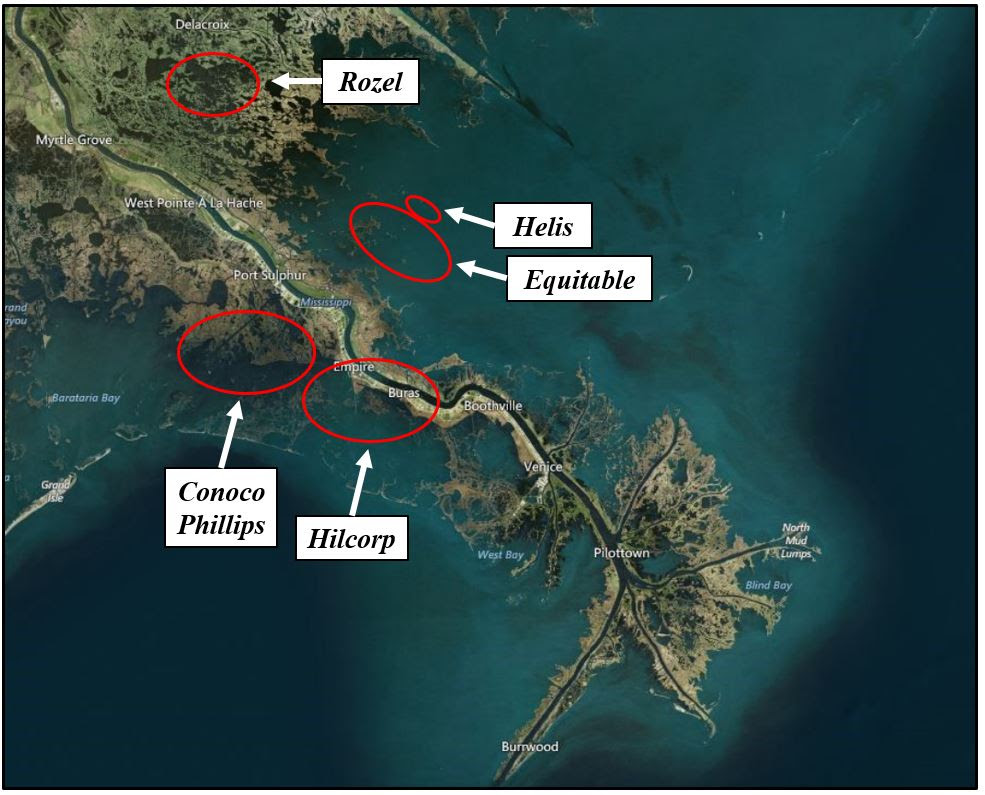 The first five Plaquemines Parish Coastal Zone Management Act (“CZMA”) cases to be set for trial have been chosen. The Plaintiffs selected Parish of Plaquemines v. Rozel Operating Company, et al., Parish of Plaquemines v. ConocoPhillips Company, et al., and Parish of Plaquemines v. Hilcorp Energy Company, et al. The Defendants picked Parish of Plaquemines v. Equitable Petroleum Corporation, et al. and Parish of Plaquemines v. Helis Oil & Gas Company, LLC, et al. The approximate locations of the fields involved in the trial cases are shown below: