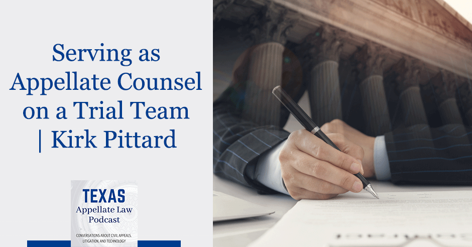 Sometimes an appellate attorney’s most important work never reaches an appellate court. Appellate counsel can play a critical part in trial court proceedings—helping make a record, making legal arguments, and assisting trial counsel with issues that might come up on appeal. Kirk Pittard, one of the founders of Durham, Pittard & Spalding, LLP, relishes that role. He specializes in civil appeals, but spends much of his practice helping